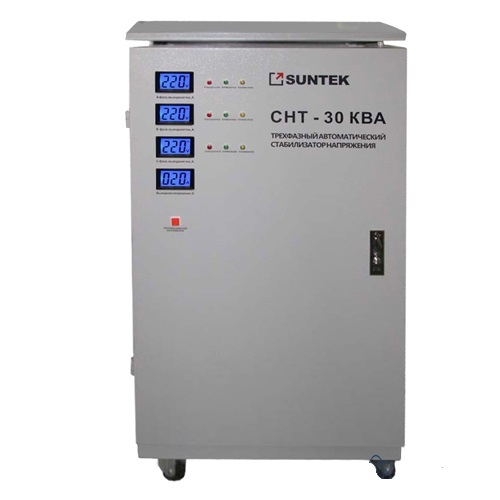 Стабилизатор трехфазный SUNTEK СНТ 30000 ВА мощностью 30 кВА используется для защиты оборудования, установленного на промышленных объектах, в частных домах, дачах, от перепадов напряжения и короткого замыкания. Стабилизатор поддерживает широкий диапазон входного напряжения и отключается только при выходе за рамки фазного 120-285 Вольт.