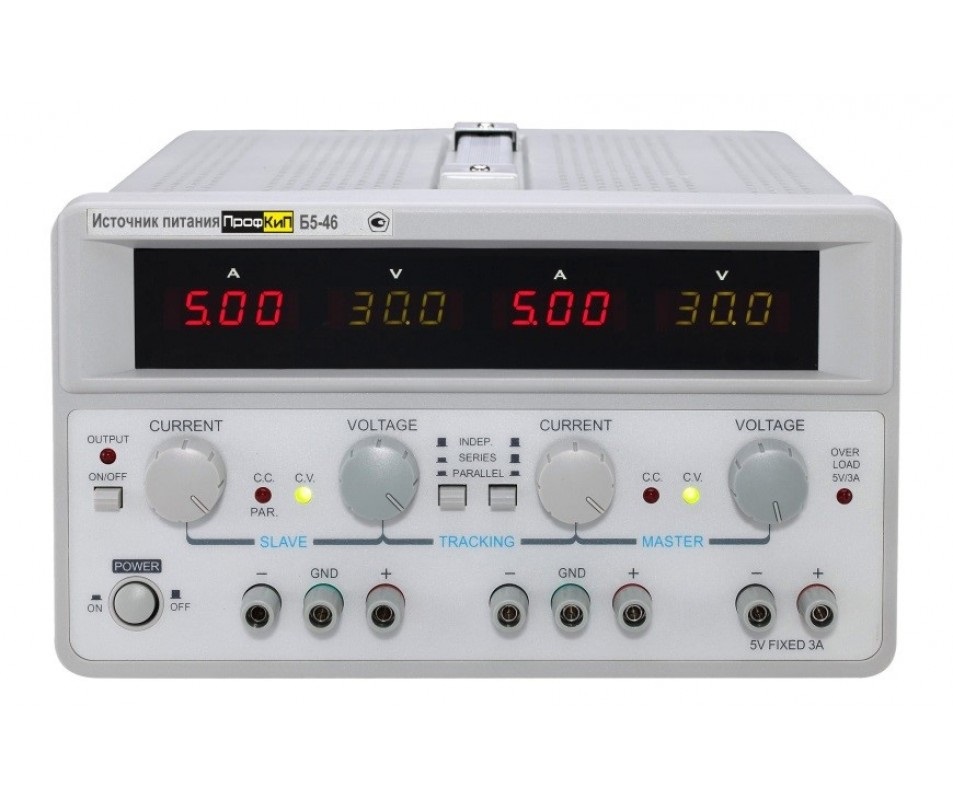 Источник питания ПрофКиП Б5-46 создан для питания стабилизированным напряжением и током узлов, и схем радиоэлектронной аппаратуры, при проведении работ в процессах наладки, ремонта и лабораторных исследований. Источник питания отличается от аналогичных моделей малым уровнем шумов и пульсаций выходного напряжения и тока. Прибор включен в государственный реестр средств измерений РФ и допущен к применению в сфере метрологического контроля.